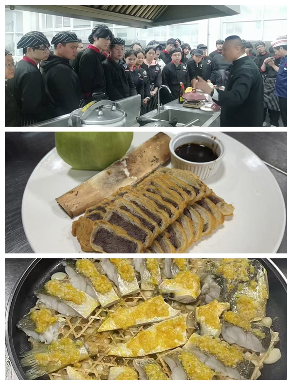 李教授先后演示了“脆皮雪花牛肉”和“黄辣椒酱生焗野生大黄鱼”的制作全过程。从选材处理、火候把握到调味装盘,每个步骤都细致讲解,手法娴熟。成菜后,学生们品尝时纷纷称赞其口感与风味.
