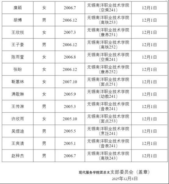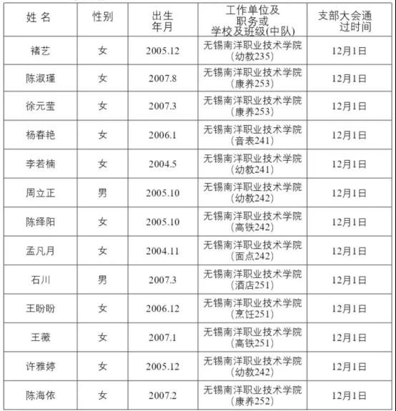 经征求团员群众意见,团支部大会集体研究,并报上级团组织批准拟接收褚艺等26名同志为新发展团员,现予以公示。公示时间:2025年12月8日至12月12日。