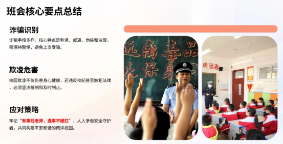 班会最后,全体同学进行反诈防欺凌集体宣誓,共同作出承诺:牢记反诈三不一多原则,坚决抵制校园欺凌,遇到诈骗、欺凌立即报告,主动做校园安全的守护者。大家纷纷表示,此次班会收获满满,不仅掌握了实用的反诈防欺技巧,更树立了“安全第一”的意识,今后会提高警惕,互相提醒,共同维护安全和谐的校园环境。