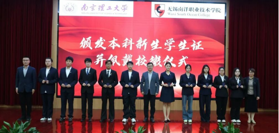 南京理工大学继续教育学院院长助理史炯煜,我校教务部部长郭春燕、发展部副部长柳斌,共同为2025级本科新生代表颁发学生证,赋予他们崭新身份的认可。