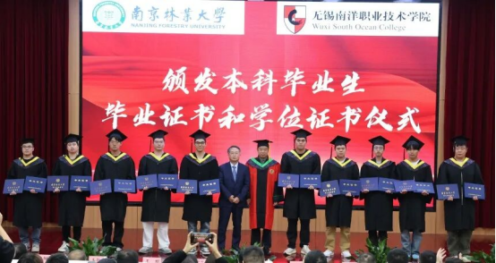 南京林业大学原继续教育学院院长李化俗、我校副校长王刚共同为本科毕业生代表颁发毕业证书与学位证书,并为毕业生拨穗。